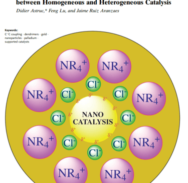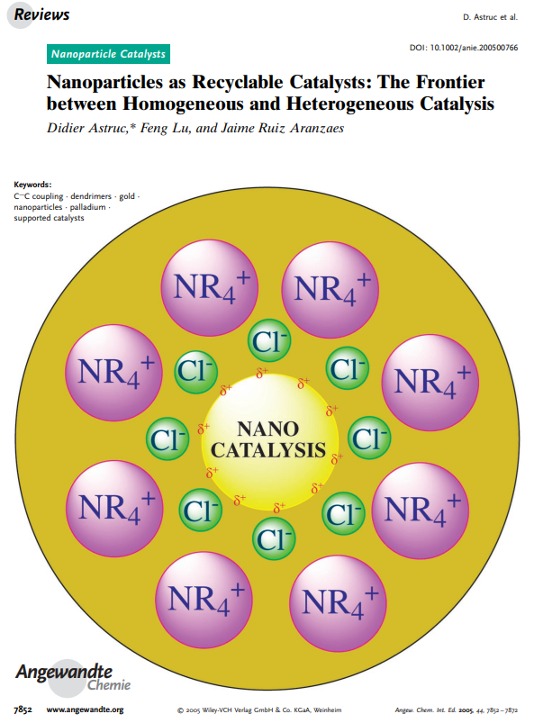 Interest in catalysis by metal nanoparticles (NPs) is increasing dramatically, as reflected by the large number of publications in the last five years. This field, “semi-heterogeneous catalysis”, is at the frontier between homogeneous and heterogeneous catalysis, and progress has been made in the efficiency and selectivity of reactions and recovery and recyclability of the catalytic materials. Usually NP catalysts are prepared from a metal salt, a reducing agent, and a stabilizer and are supported on an oxide, charcoal, or a zeolite. Besides the polymers and oxides that used to be employed as standard, innovative stabilizers, media, and supports have appeared, such as dendrimers, specific ligands, ionic liquids, surfactants, membranes, carbon nanotubes, and a variety of oxides. Ligand-free procedures have provided remarkable results with extremely low metal loading. The Review presents the recent developments and the use of NP catalysis in organic synthesis, for example, in hydrogenation and CC coupling reactions, and the heterogeneous oxidation of CO on gold NPs.